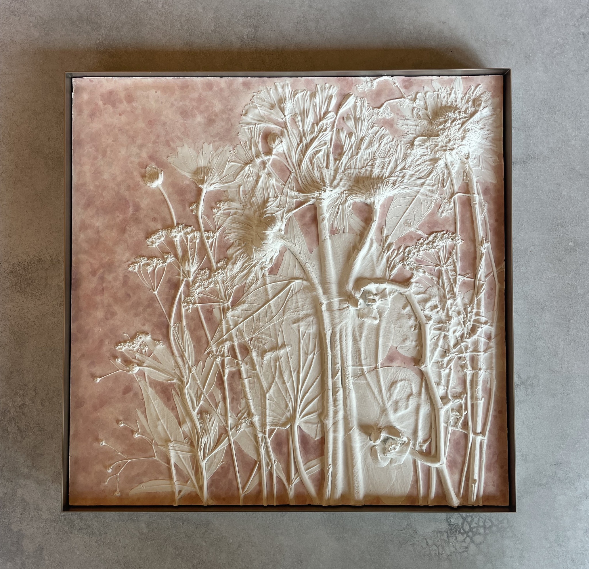 先日制作させて頂いた30cmサイズのbotanical plasterになります。今回ピースの彩色は新たな試みでした。これまでは、ベース色は単色塗りもしくはグラデーションでの彩色でしたが、今回は刷毛目残しの濃淡を活かすイメージで彩色を行いました。程よいムラ感が良い雰囲気かと思います。